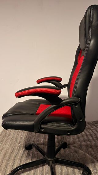 Silla de estilo gamer con un diseño ergonómico y deportivo. Combina colores negro y rojo para un aspecto llamativo. Tiene muy poco uso. solo de oficina. Solo tiene controles de altura. Detalle a la vista. - Tapicería en polipiel. - Respaldo alto con soporte para cabeza. - Reposabrazos acolchados. - Base con ruedas para fácil movilidad.