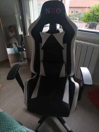 Se vende silla gaming de la marca NEO. Está en muy buen estado, apenas usada. - Diseño deportivo y elegante en blanco y negro. - Cómoda y ergonómica para largas sesiones de juego. - Incluye cojín lumbar y reposacabezas.
