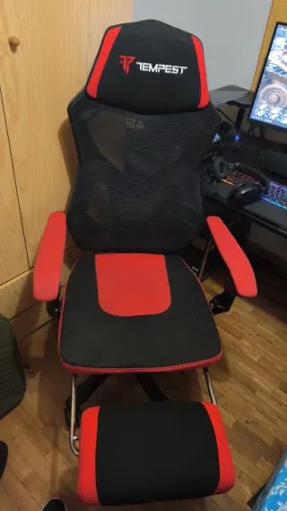 Silla de gaming con un diseño moderno en negro y rojo. - Respaldo alto con malla transpirable. - Cojín lumbar y reposacabezas. - Reposabrazos acolchados. - Reposapiés extraíble. silla adquirido en el mes de marzo, tiene garantía