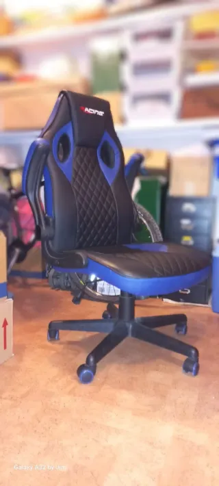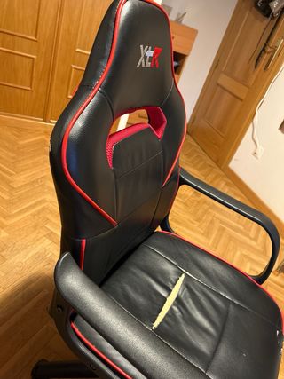 Silla de escritorio tipo gamer con acabado en polipiel. - Diseño ergonómico. - Detalles en color rojo. - Base estable. - El descosido se puede tapar con un pequeño cojín, no tiene más de dos años.