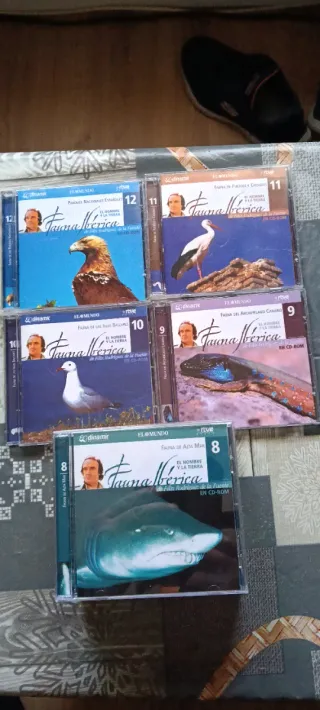 Colección de CD-ROMs de Fauna Ibérica, editada por El Mundo. - Títulos incluidos: Parques Nacionales Españoles (12), Fauna de Puros y Cigüeñas (11), Fauna de las Islas Baleares (10), Fauna del Archipiélago Canario (9), Fauna de Alta Mar (8). - Cada CD-ROM presenta imágenes de la fauna y la tierra. - Incluye la obra de Félix Rodríguez de la Fuente.