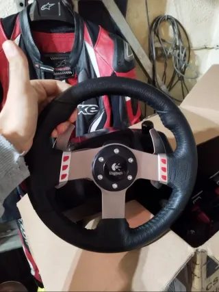 Conjunto de volante más pedales para pc de la marca Logitech,con 4 botones configurables y vibración en el volante .
