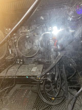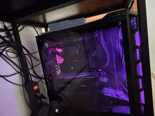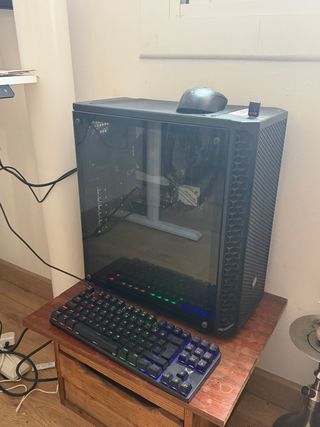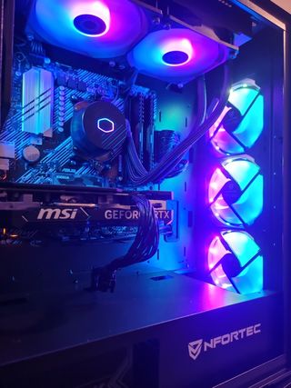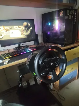 Equipo gamer con refrigeración líquida y volante. - Torre PC con iluminación RGB. - Volante de conducción Thrustmaster. Vendo todo consultar por si interesa algo individual.