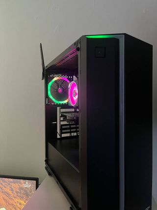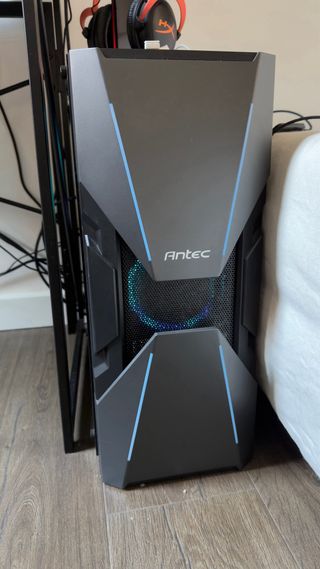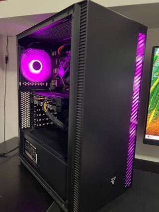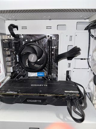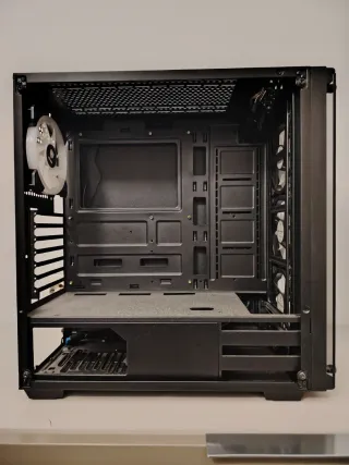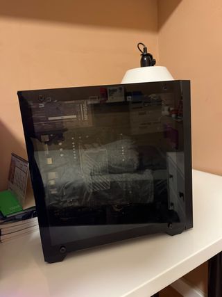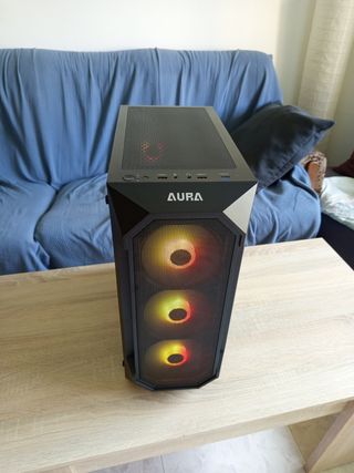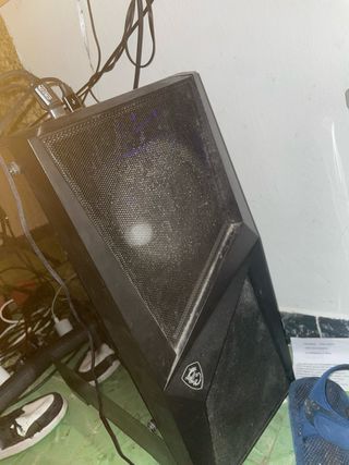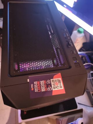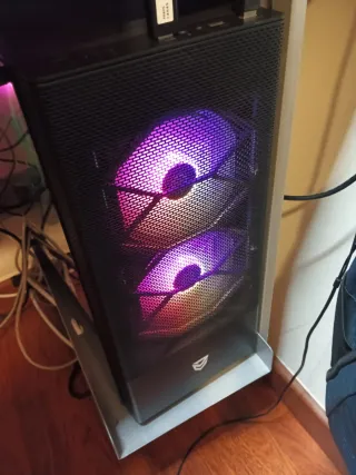 Torre para ordenador de sobremesa con iluminación RGB. Tiene 4 años. Solo le faltan dos tornillos de la tapa de cristal que se perdieron limpiando el interior. Ryzen 5 5600G Placa gigabyte B450M S2H RAM Corsair 16Gb DDR4 Gràfica Nvidia GeForce GTX 1060 6GB DDR5 SSD Kingston NVMe 4x 250Gb (nuevo de hace 1 semana)