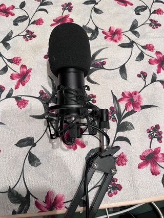 Micrófono de condensador con filtro anti-pop y brazo articulado. - Incluye araña para el micrófono. - Base de escritorio con brazo ajustable.