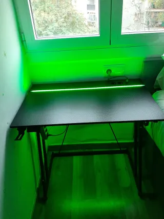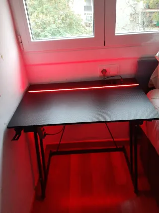 Mesa de escritorio con diseño moderno, ideal para gaming o estudio. Cuenta con iluminación LED integrada que crea un ambiente inmersivo. - Superficie con acabado texturizado. - Estructura metálica robusta. - Iluminación LED RGB. - Diseño ergonómico.