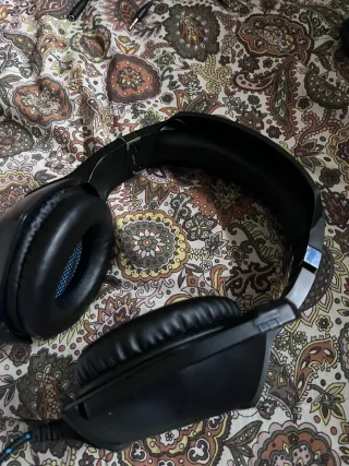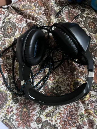 Auriculares negros para gaming. El cable tiene un diseño trenzado con detalles en azul. - Diseño ergonómico. - Almohadillas acolchadas. - Conector jack de 3.5mm. Precio negociable