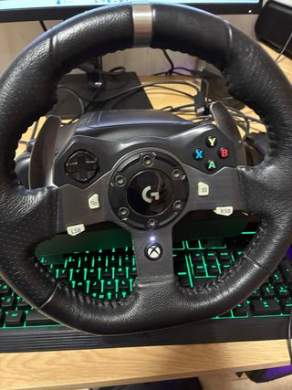 Volante de gaming Logitech G920. - Diseño deportivo con acabado en cuero. - Palancas de cambio de marchas. - Botones de control integrados. Hago envíos Funciona perfectamente Único desperfecto el emblema de la marcha
