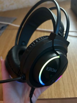 Auriculares gaming KROM Kappa con iluminación RGB. - Diseño ergonómico. - Micrófono flexible. - Conexión USB. - Sonido estéreo. Los he utilizado una vez para probarlos y luego para hacerles las fotos, los vendo porque los compré hace poco y en Navidad me regalaron otros diferentes.