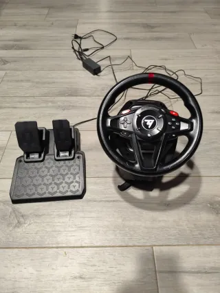 Volante y pedales para gaming, con un diseño deportivo y ergonómico. - Volante con agarre cómodo. - Pedales de acelerador y freno. - Base con logo de la marca Thrustmaster