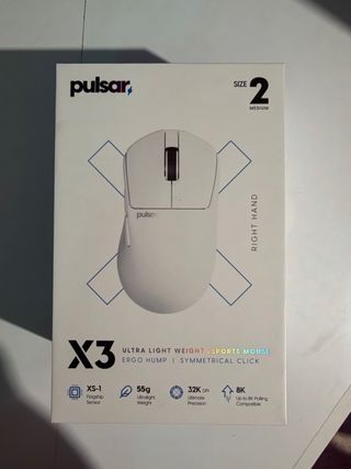 Ratón gaming Pulsar X3, talla M, diseñado para eSports. Nuevo, lo estrenas TU, era un regalo, pero no se adapta a mi mano. El mejor Mouse a día de hoy. - Diseño ergonómico con ergo hump. - Clics simétricos. - Sensor Flagship XS-1. - Peso ultraligero de 55g. - Precisión de hasta 32K DPI. - Compatible con polling rate de hasta 8K.
