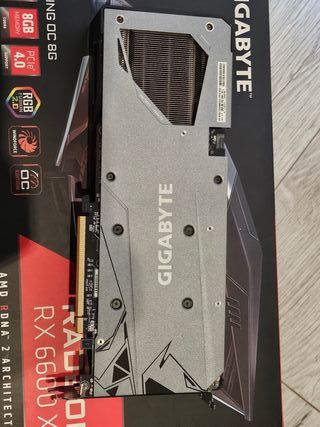 Vendo Gigabyte Radeon RX 6600 XT Gaming OC 8GB, en excelente estado y funcionando 100 %. Se ve en las fotos: ✔️ Tarjeta limpia, sin golpes ni óxido ✔️ Backplate impecable ✔️ Caja original + espuma protectora original ✔️ Ventiladores silenciosos, sin ruidos raros La vendo porque actualicé equipo. - Modelo: RX 6600 XT Gaming OC - Memoria: 8GB GDDR6 - Interfaz: PCIe 4.0 - Tecnología: AMD RDNA 2 Architecture - Refrigeración: WINDFORCE - Iluminación: RGB FUSION 2.0
