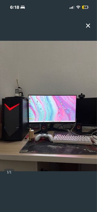 Se vende un completo set de PC gaming, listo para usar. - Torre de PC con iluminación LED roja. - Monitor con pantalla de alta resolución. - Teclado mecánico blanco. - Mando de control. - Altavoces pequeños.