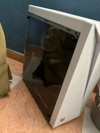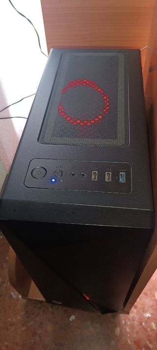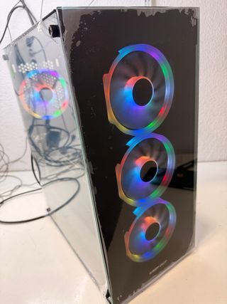 Caja gamin negra con cristal lateral rota y le falta una pata solo es estética no influye en rendimiento por este precio tienes un buen pc - Tarjeta gráfica AMD RX 580. - 16GBdeRAM.hdisipador original del i5 uhb de luces led - Procesador Intel i5 2400. - Disco duro de 1TB (HDD). - Ventilador con luz LED.