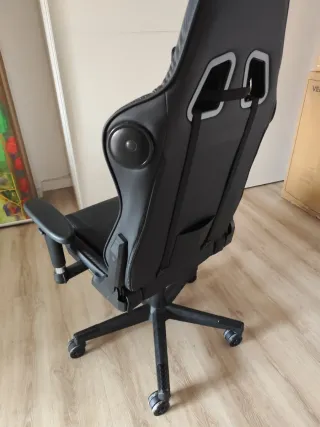 Silla de gaming con un diseño ergonómico y deportivo, combinando colores negro y azul. - Tapicería en polipiel y tela. - Respaldo reclinable. - Cojines lumbar y cervical incluidos. Precio negociable!