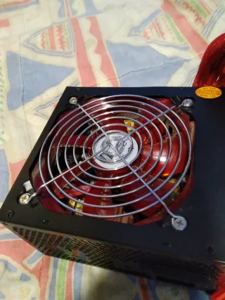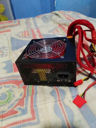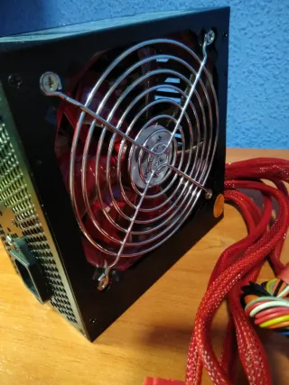 Fuente de alimentación para PC con un llamativo diseño en color rojo y negro. Para ordenador sobremesa Windows 600W - Ventilador con rejilla metálica. - Cables de alimentación enfundados en rojo.
