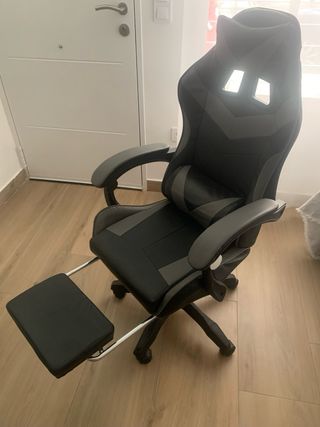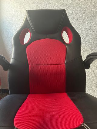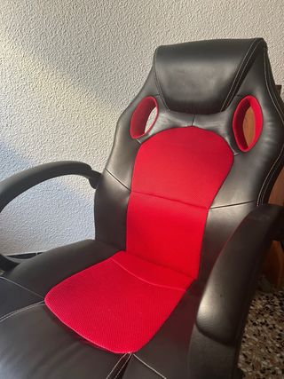 Silla de estilo gaming en buen estado, con un diseño ergonómico y cómodo. - Tapicería en polipiel negra. - Inserciones de tela roja. - Acolchado en asiento y respaldo.