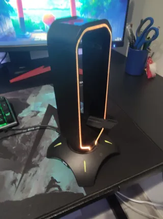 Soporte para cascos y mando de PC con iluminación RGB. - Diseño moderno en color negro. - Base estable con detalles luminosos. - Incorpora dos puertos USB 3.0 adicionales. - El RGB se puede encender y apagar.