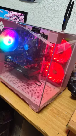 Vendo mi Ordenador gaming con una llamativa carcasa rosa y detalles de iluminación. No negociable - Ventana lateral de cristal templado. - Ventilador RGB frontal. - Iluminación interior roja. - Pantalla 24 pulgadas AOC 75hz - Teclado mecánico y ratón Características: Core i5 9600k 12gb ddr4 240gb ssd + 2 discos de 1tb total 2tb Gtx 1050ti 4gb Windows 11 Perfecto para jugar en 1080p NO NEGOCIABLE NO MAREANTES
