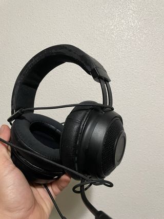 Auriculares gaming Razer Kraken X en color negro. Diseñados para ofrecer comodidad y un sonido inmersivo. El cable falla habría que repararlo. Conservo la caja original. - Diadema acolchada. - Almohadillas suaves. - Micrófono flexible y retráctil.