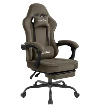 Silla de gaming ergonómica con reposapiés extraíble y función de masaje. - Color: Marrón. - Material: Tela. - Incluye cojines lumbar y cervical. - Base con ruedas para fácil movilidad.