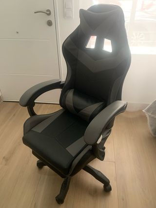 Silla ergonómica de estilo gaming, ideal para tu escritorio, oficina o zona de estudio. Su diseño combina el color negro con detalles en gris. - Respaldo alto con soporte. - Reposabrazos acolchados. - Base giratoria con ruedas. - Cojines lumbares y de reposacabezas incluidos.