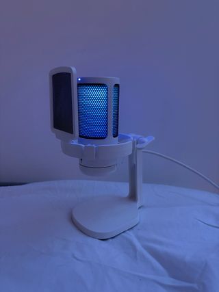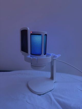 Micrófono de sobremesa con un diseño moderno y luz LED azul. - Base estable. - Soporte ajustable. - Rejilla protectora con patrón de puntos. - Tiene un botón para silenciar el micrófono en el momento en que tú quieras - Tiene varios tipos de luces led - Tiene también para meter unos cascos y escuchar por ellos y hablar con el micrófono gaming