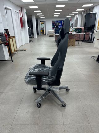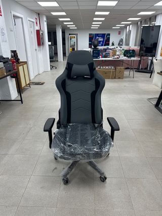 Silla ergonómica de estilo gaming, diseñada para largas sesiones. - Tapicería en polipiel negra con detalles rojos. - Respaldo reclinable. - Reposabrazos acolchados. - Base con ruedas para fácil movilidad.