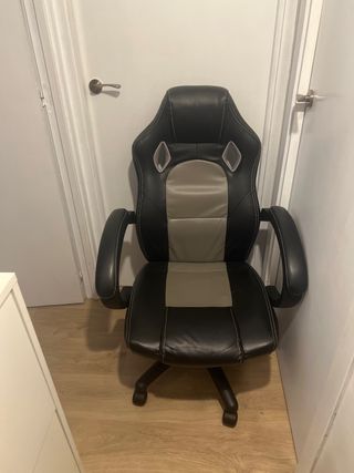 Silla ergonómica de estilo gamer, diseñada para ofrecer comodidad. - Tapicería en cuero sintético negro y detalles en gris. - Costuras blancas decorativas. - Base con ruedas para fácil movilidad.