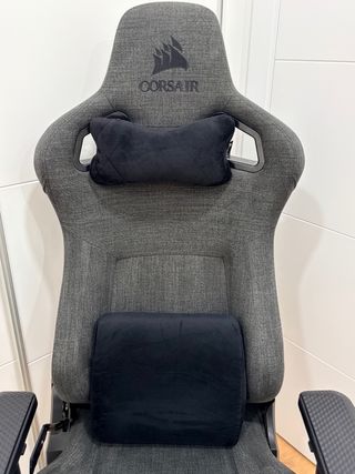 Silla de gaming Corsair T3 Rush en color gris. Diseñada para ofrecer comodidad durante largas sesiones. - Tapicería de tela transpirable. - Almohada cervical y lumbar incluidas. - Base de cinco radios con ruedas. - Reposabrazos Muy bien cuidada sin rotos ni roces, vendo por falta de uso