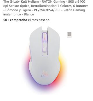 Ratón gaming inalámbrico G-Lab Kult Helium en color blanco. Diseñado para ser cómodo y ligero. - Sensor óptico con 800 a 6400 dpi. - Retroiluminación con 7 colores. - 6 botones. - Compatible con PC/Mac/PS4/PS5.