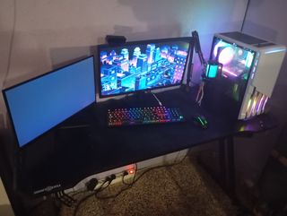 Quiero vender mi setup gaming MSI. Está en muy buen estado y casi listo para usarse. - Incluye dos monitores. - Torre PC MSI con iluminación RGB. - Teclado y ratón gaming con retroiluminación RGB. - Alfombrilla de ratón. -Mesa gaming de calidad con luces led -webcam nuorum V11 La torre trae una placa base Asus prime B760-plus b4, un procesador Intel core i5 12400f, 4 módulos de ram de 8gb a 3200mhz, una rtx 3060 de 12gb, una fuente de poder mars gaming de 750w y cerfificacon 80 plus silver, trae 2 ventiladores suplementarios con su propia controladora para cambiar color y modos, más información y precio al privado.