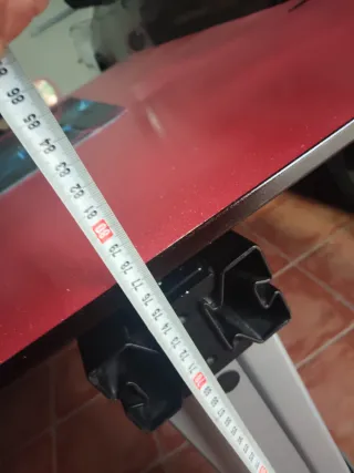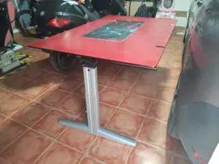 Mesa Gaming de gran tamaño con superficie roja y detalles en el centro.Ideal colocar varias pantallas, ordenador y demás material. - Base laminada roja en muy buen estado,robusta y sin desperfectos. - Dispone de recogida cables inferior y guiado de los mismos. - Estructura metálica soporta 250 kgr. - Altura ajustable. - Diseño moderno. - Medidas en fotos. No envío (peso y medidas excesivas). ** Estructura patas desmontables. Si la ves y te gusta, puedo acercarla a 20 kmtr de Jaén.