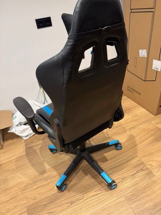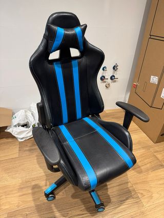 Silla de estilo gaming, ideal para escritorio o PC. Diseñada para ofrecer comodidad. - Tapicería en negro con detalles en azul. - Respaldo alto con soporte para cabeza. - Reposabrazos acolchados. - Base con ruedas para fácil movilidad.