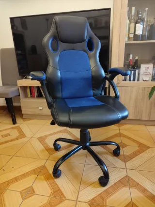 Silla de estilo gaming con un diseño ergonómico y cómodo. - Tapicería en polipiel negra. - Inserciones de tela azul en asiento y respaldo. - Reposabrazos acolchados.