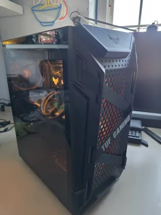 Caja para ordenador Asus TUF Gaming G301 con un diseño llamativo. - Panel frontal con detalles en malla y luces. - Ventana lateral de cristal templado. - Interior espacioso para componentes. - Incluye 3 ventiladores ARGB, uno normal, su controladora, etc.) y su caja, como venía al comprarlo.