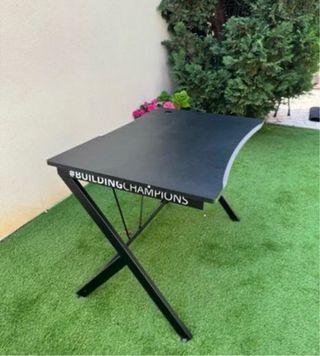 Mesa de escritorio diseñada para gaming, modelo GXT 711 Dominus. - Superficie de color negro, algunos signos de uso en el tablero, en buen estado general. - Estructura de patas metálica en forma de X. - MEDIDAS: Ancho: 116 cm  Profundidad: 75 cm  Altura: 76 cm - Incluye soporte para auriculares. - Incorpora un portavasos. SE ENTREGA DESMONTADO.