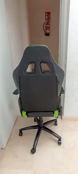 Silla ergonómica de estilo gaming, con un diseño moderno en negro y detalles en verde. - Respaldo alto con soporte lumbar. - Reposabrazos acolchados. - Base con ruedas para fácil movilidad.