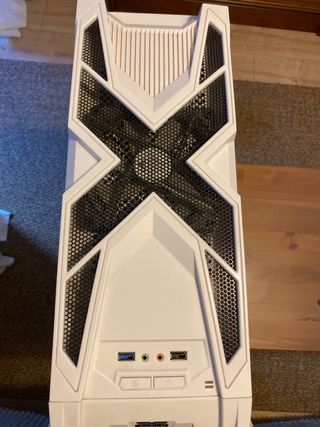 Caja para ordenador de estilo gaming con un diseño moderno y elegante en color blanco. Cuenta con una rejilla frontal y superior para ventilación. - Diseño frontal en forma de X. - Puertos frontales USB y de audio. - Botones de encendido y reinicio.