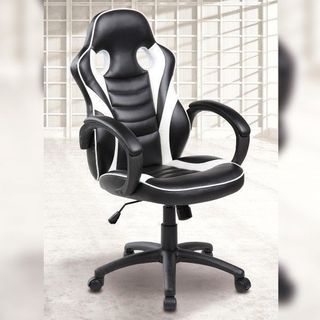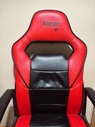 Silla de gaming ergonómica con un diseño deportivo y moderno. La silla ha tenido uso, teniendo raspados en el cuero del asiento, pero manteniendo el perfecto funcionamiento tanto para subir y bajar el asiento como la regulación de la espalda. - Tapicería en cuero sintético negro. - Reposacabezas y soporte lumbar incluidos. - Base con ruedas para fácil movilidad.