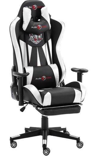 Silla ergonómica de estilo gaming, diseñada para largas sesiones. - Tapicería en polipiel negra y detalles en azul. - Respaldo reclinable. - Reposapiés extraíble. - Altura ajustable.