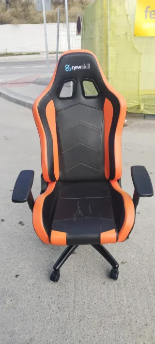 Silla de estilo gaming con un diseño ergonómico y deportivo. La piel de la parte del asiento como se aprecia tiene desperfectos, pero por lo demás todo vien - Tapicería en polipiel negra con detalles en naranja. - Respaldo alto con soporte lumbar. - Reposabrazos acolchados. - Base con ruedas para fácil movilidad.