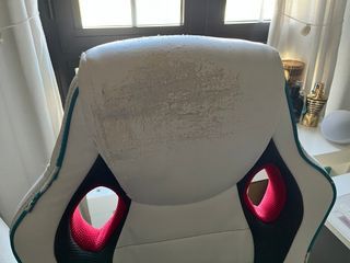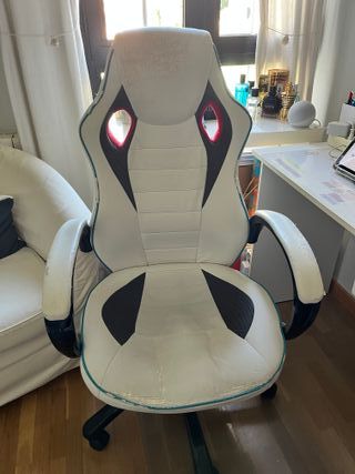 Silla ergonómica de estilo gamer, ideal para largas sesiones de juego o trabajo. Su diseño combina blanco, negro y detalles en rojo. Esta usada pero sigue funcionando perfectamente. - Diseño ergonómico. - Tapicería en blanco y negro. - Detalles en color rojo.
