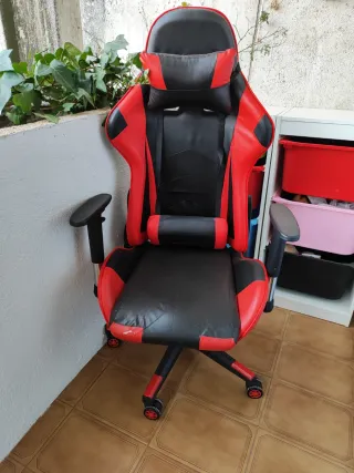 Silla ergonómica de estilo gamer, ideal para largas sesiones de juego o trabajo. Su diseño combina colores negro y rojo, con detalles deportivos. - Respaldo alto con soporte lumbar y cervical. - Reposabrazos acolchados. - Base con ruedas para fácil movilidad.