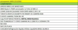 Placa- Msi pro b650-m-b Cpu- Ryzen 5 8600g Ram- T create. 1x32gb 5600- 46cl M.2 - 1tb Kingston 3s Fuente-Deepcool pl 650 d atx 3.0 Tarjeta wifi y bluetooth pci Caja- Xn200m antec Windows 11 si quiere una gráfica Rx 6600 8gb más 150€ No leer: Rx 6600 xt Rx 5600 xt Rx 5700 xt gtx 1660 super rtx 2060 2070 2080 2090 rtx 3060 ti rtx 3070 3080 3090 ti 4060 4070 4080 4090 Intel core ultra i3 i5 i7 i9 ryzen 5600x 5700x 5800x 5900x 5800x3d b650 b450 b660 b860 b760 b550 x570 z690 z790 z890 aorus amd radeon 12600k 13600k 14600k 245k 9600x9700x