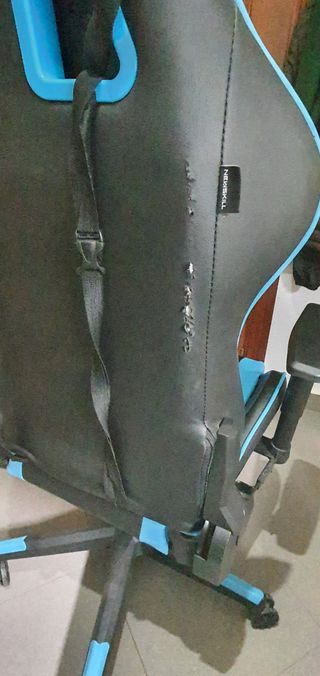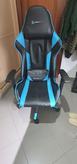 Silla gaming en perfecto estado, con muy poco uso. Su diseño combina el negro y el azul para un estilo moderno. - Tapicería de cuero sintético. - Costuras blancas decorativas. - Reposabrazos acolchados.