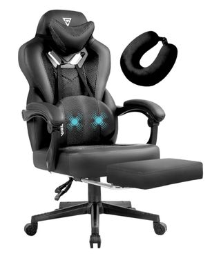Silla ergonómica de estilo gaming en color negro. - Funcion de masaje - Respaldo alto con soporte lumbar. - Reposacabezas ajustable. - Reposapiés extraíble. - Base con ruedas para fácil movilidad.