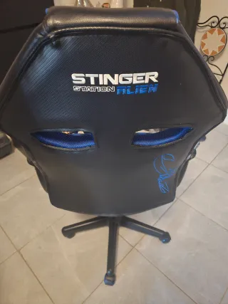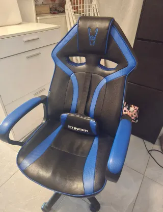 Silla de estilo gaming en color azul y negro. Tendra alguna marca de uso pero esta perfecta y muy comoda - Diseño ergonómico. - Acolchado en cabeza y lumbar. - Base con ruedas.