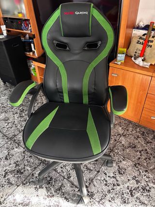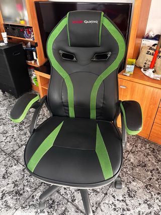 Silla de estilo gaming con un diseño moderno en color negro y detalles en verde. - Tapicería en polipiel. - Respaldo ergonómico. - Reposabrazos acolchados. - Base con ruedas para fácil movilidad.