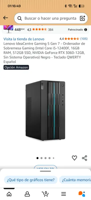 Ordenador de sobremesa gaming Lenovo IdeaCentre. - Procesador Intel Core i5-12400F. - 16GB de RAM. - SSD de 512GB. - Tarjeta gráfica NVIDIA GeForce RTX 3060 de 12GB. - Teclado QWERTY en español. Le falla la grafica se puede reparar o cambiar ESCUCHO OFERTAS pero funciona perfectamente se crashea solo en juegos